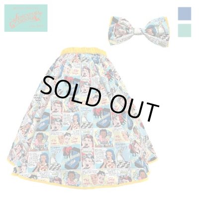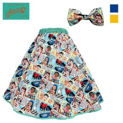 SpiceUp★Groovy×mut_s2コラボ!アメコミ柄サーキュラースカート☆共布ヘアリボン付き!ロイヤルブルー 全3色